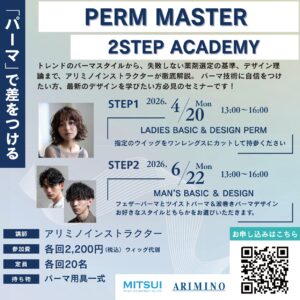 イベント・セミナー 2026.02.20 PERM MASTER 2STEP ACADEMY 開催日 4月20日 6月22日 時間 13:00~16:00 講師 アリミノインストラクター 開催場所 ミツイ 浜松支社スタジオ 受講料 各回¥2,200(税込)